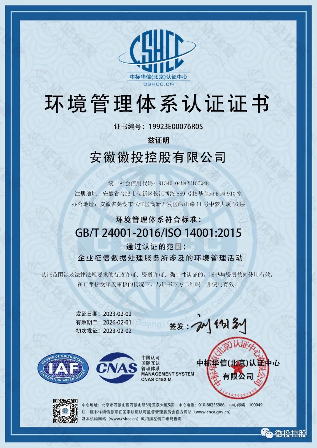 徽投控股自成立以来,公司上下同心,密切配合,按照体系认证要求对相关管理流程进行认真梳理,将体系思维与公司实际相结合,对认证审核项目进行了分解,严格开展自查自纠。在此期间,认证机构分别对我司管理层、各职能部门进行全面、客观地审查和综合评价,顺利完成“三体系”认证。
